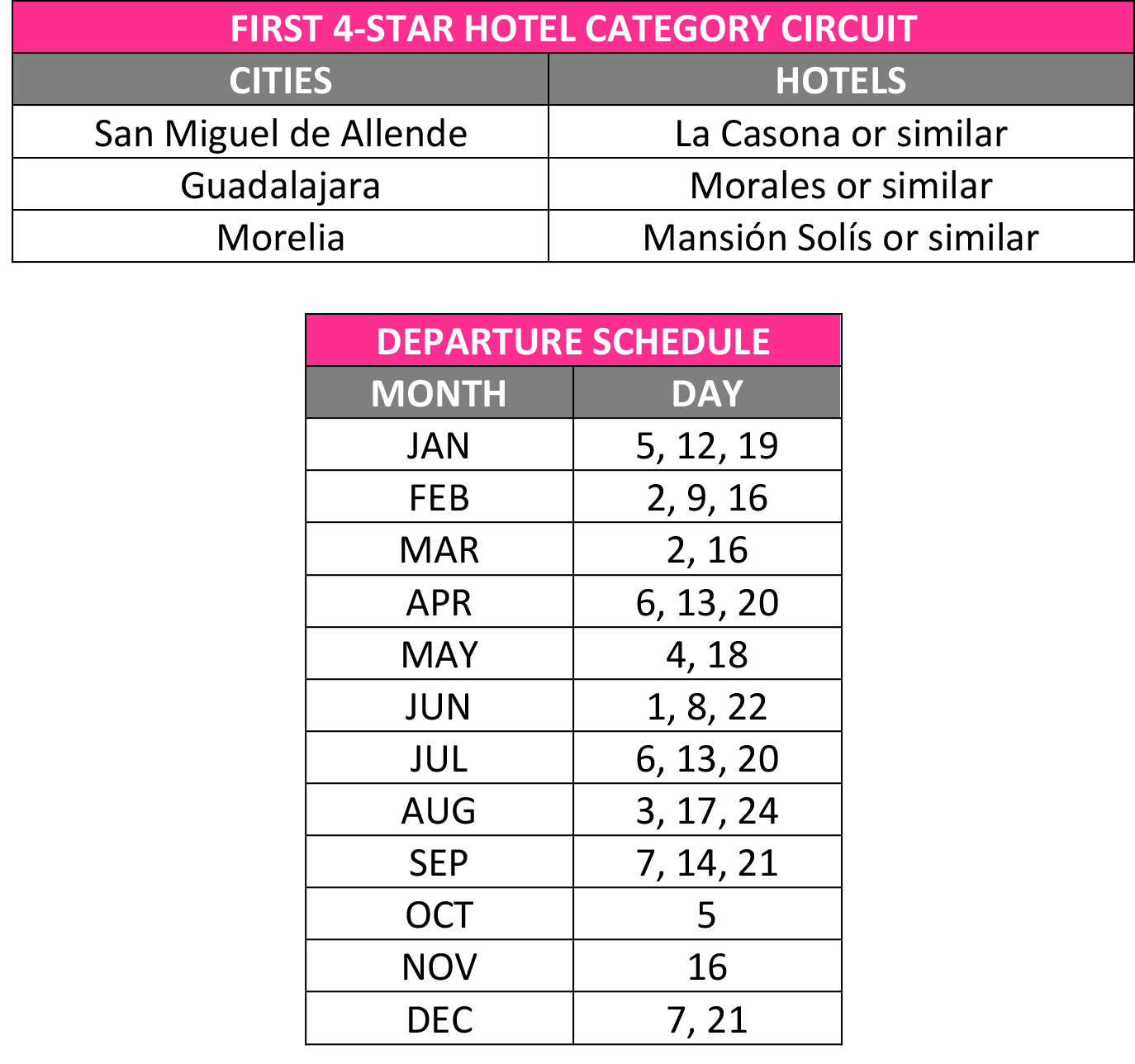 - Visiting: Pueblo Mágico of San Miguel de Allende, Guanajuato, Guadalajara, Pueblo Mágico of Tequila, Morelia, and Pueblo Mágico of Pátzcuaro.